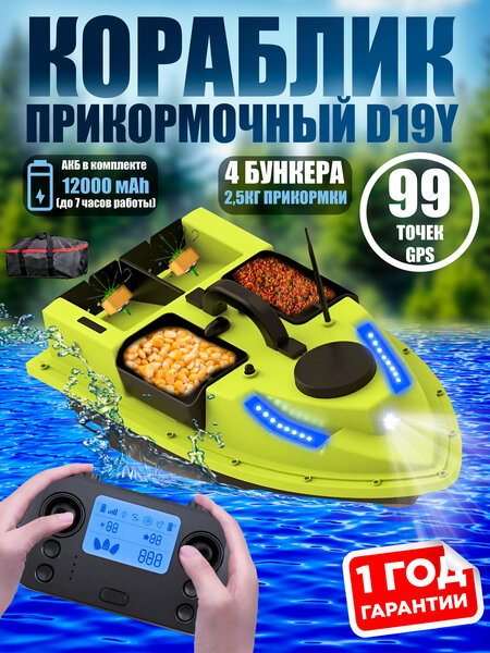 Новейший прикормочный кораблик Amazin GPS D19Y со встроенным GPS на 99 точек и Авто-возвратом. D19Y имеет 4 независимых бункера, два по бокам и два сзади, которые могут вместить 2-3 кг прикормки, приманки, бойлов и рыболовных снастей, каждый из 4 лотков управляется отдельно. На сегодняшний день это лучшее предложение по соотношению цена/качество/функциональность которое включает в себя качественную сборку и отличный функционал. Кораблик GPS D19Y 2024 года выпуска получил вот такие обновления 1) новый внешний вид 2) новый пульт управления с отображением заряда АКБ на экране; 3) увеличенная память до 99 GPS точек; 4) функция Автоматического возврата на домашнюю точку; 5) способный развивать скорость до 7 км/ч; 6) новое расположение бункеров - 2 по бокам и 2 сзади, сброс по отдельности; 7) 4 бункера способных уместить в себе 2-3 кг прикормки, бойлов и снастей; 8) пропилы в задних бункерах для закладывания снасти; 9) независимый сброс прикормки позволит прикормить рыбу в разных местах за один раз; 10) встроенный гироскоп для устойчивости кораблика; 11) функция Круиз Контроля (автоматическое движение в выбранном направлении); 12) двигатели с винтами с защитой от повреждений и попадания водорослей; 11) улучшенный свет, кораблик имеет 1 основной фонарь, 2 по бокам и 2 светодиода-поворотника которые работают в разноцветном режиме. В кораблик встроен GPS, что позволяет сохранять 99 точек позиционирования в памяти и автоматически перемещаться по этим 99 точкам. Автовозврат вернёт кораблик для прикормки на домашнюю точку в трех случаях: 1) При включении кнопки автовозврата на пульте. 2) При выключении пульта. 3) При потере связи с пультом на большом расстоянии. Технические характеристики кораблика Amazin GPS D19Y: Li-ion аккумулятор на 12000 мАч до 6-7 часов непрерывной рыбалки; Управление до 500 метров; Пульт с частотой 2,4 ГГц с защитой от помех; Питание пульта от 3 батареек типа АА 1,5В; Размер кораблика: 54 x 27 x 20 см; Вес кораблика: почти 2 кг; Гарантия 1 год! Комплектация прикормочного кораблика Amazin D19Y GPS: Прикормочный кораблик Пульт управления Аккумулятор 12000 мАh Сумка Зарядное устройство 220V Силиконовый чехол для пульта Антенна на кораблик Батарейки для пульта Инструкция на русском языке