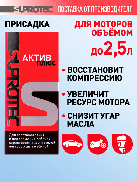 Присадка для двигателя легковых автомобилей с пробегом более 50 000 км и для 4-х тактной мототехники. Применима для дизельных, бензиновых и газовых моторов рабочим объёмом до 2,5 литров, т. ч. турбированных. Она восстановит износ, избавит от задиров цилиндропоршневой группы, шеек валов, шестерен маслонасоса и других пар трения ДВС. Активный компонент состава под воздействием высоких температур и давления формирует на трущихся поверхностях защитно-восстановительный металлический слой. Он частично восстанавливает размеры и геометрию изношенных деталей, оптимизирует зазоры в парах трения. Снижает интенсивность последующего износа. За счёт своей пористой структуры слой удерживает на себе большее количество масла, в сравнении с необработанными двигателями. Восстановление происходит за счёт металлической выработки, содержащейся в масле. Таким образом двигатель «лечится» не инородным, а собственным металлом. Защитный слой сохраняется 60 000 – 80 000 км. Присадка в двигатель для восстановления износа продлит жизнь мотора вашего автомобиля в 2-2,5 раза. Эффекты от применения состава Suprotec: • Повышение мощности и экономия топлива - частичное восстановление износа ЦПГ и плотный масляный слой уплотняют зазоры в цилиндропоршневой группе, обеспечивают необходимую газоплотность. Это восстанавливает компрессию и выравнивает ее по цилиндрам. Повышается качество сгорания топлива, тем самым помогая мотору избавится от жора масла или снизить его. Кроме того, плотный масляный слой смещает режим трения в сторону гидродинамического, что снижает потери на трение. Все это приводит к увеличению мощности двигателя при одновременной экономии топлива на 6-8%. • Снижение угара масла (антидым) – защитный слой восстанавливает плотность узла гильза – кольцо – поршневая канавка. Это улучшает съем смазки со стенок цилиндра, особенно при повышенных оборотах двигателя. Значительно меньше масла попадает в камеру сгорания. • Уменьшение вибрации и шумов – восстановление и выравнивание компрессии по цилиндрам приводит к ровной работе двигателя. Кром того, плотный слой масла смягчает перекладку поршней. Все это снижает вибрацию и шум в двигателе. • Снижение токсичности и дымности – восстановление компрессии и оптимизация зазоров в цилиндропоршневой группе обеспечивают качественное сгорание топлива и снижают угар масла, что приводит к снижению токсичности и дымности двигателя. • Избавление от стука гидрокомпенсаторов – защитный слой оптимизирует зазоры, что нормализует масляное давление и обеспечивает штатную работу механизма. Достигается эффект стоп шум гидрокомпенсаторов. • Увеличение ресурса - защитный слой значительно снижает интенсивность изнашивания наиболее нагруженных деталей трения, которые определяют ресурс двигателя. Если двигатель начал дизелить, попробуйте наш триботехнический состав. • Защита при повышенных нагрузках – защитный слой значительно эффективней предотвращает износ деталей трения при повышенных нагрузках за счет структурных особенностей (микротвердость и микроупругость) и удержания большего количества масла. • Обеспечит быстрый запуск двигателя при «холодном пуске» – обработанные поверхности способны удерживать масляный слой при длительном простое. Это облегчает совершение первых оборотов и предотвращает п