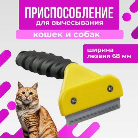 Приспособление для вычесывания кошек и собак, ширина лезвия 68 мм / Пуходерка / Дешеддер. это ручное устройство для вычесывания у животных отмершего подшерстка. Используется приимущественно во время линьки. Использовать пуходерку лучше на чистой шерстке. Если вы обожаете своего питомца приобретите пуходерку. Уникальное лезвие захватывает и вытаскивает мертвые волоски подшерстка до их выпадения, сокращая линьку до 99 процентов. Инструмент экономит ваше время, сохраняет здоровье кожи и шерсти, не повреждает остевой волос и предупреждает образование комков шерсти в желудке кошек. Вы забудете о выпавшей шерсти на полу, одежде и мебели. Кнопка самоочистки легко сбрасывает шерсть с инструмента. Защелкните ее для защиты лезвия в процессе хранения. Защитные края предупреждают давление лезвия на кожу. Инструкция: Вычёсывайте животное, проводя инструментом по направлению роста волос, проникая лезвием вглубь шерсти животного. Не задерживайтесь надолго в одной области. Удалите шерсть с инструмента путём нажатия на кнопку самоочистки.