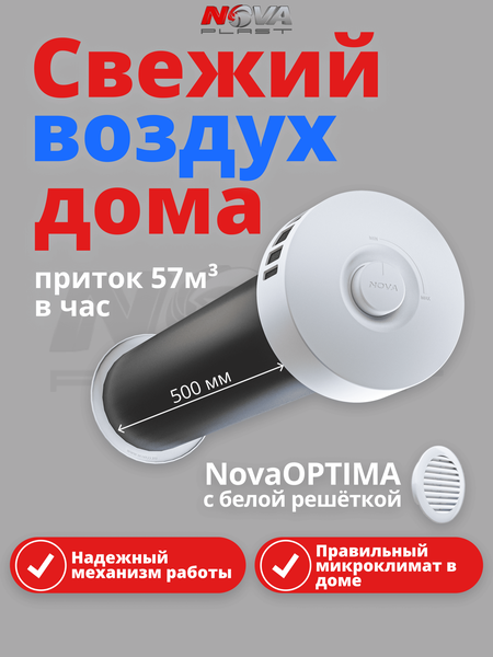 Приточный вентиляционный стеновой шумозащитный клапан NovaOPTIMA КИВ 125, комплектуется фильтром класса G3, теплозвукоизолирующим стеновым каналом длина 500 мм, круглым внутренним корпусом и белой атмосферостойкой вентиляционной решёткой. Предназначен для организации притока свежего воздуха в квартиру или дом, предотвращает появление конденсата на окнах и их запотевание, улучшает микроклимат в помещении. Осуществляет воздухообмен без сквозняков, а также фильтрует поступающий воздух от пыли. Клапан KIV 125 позволяет плавно регулировать объем поступающего воздуха, имеет надежный механизм. КИВ 125 обеспечивает до 60 м3 поступления свежего воздуха, Монтаж клапана КИВ-125 осуществляется на стену. Вентиляционный клапан выполнен из прочного и экологичного ABS пластика. Благодаря приточному клапану NovaOPTIMA исчезнет конденсат на окнах, будет свежий и чистый воздух в доме.