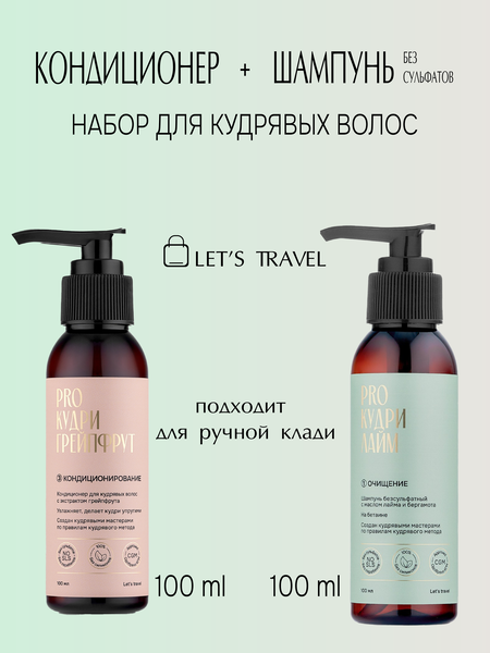 Удобный набор PROКудри Let's Travel создан специально для путешествий. Небольшой объем каждого флакона 100 мл позволяет провозить косметику в ручной клади самолета, его удобно брать с собой в дорогу, в командировку, а также это оптимальный вариант для знакомства с косметическим средством. Мини формат набора состоит из шампуня Лайм и кондиционера. Мягкий шампунь от Pro Кудри основан на бетаине. За счет отсутствия сульфатов, шампунь не сушит длину волос, обладает приятным освежающим ароматом грейпфрута и зеленого чая. Наша рекомендация- комбинированное мытье. Рекомендуем чередовать шампунь про Кудри с сульфатным шампунем, это обеспечит лучшее очищение кожи головы. Кудрявым волосам требуется особый уход. За счет работающих на увлажнение ингредиентов наш кондиционер отлично распутывает кудрявые волосы, глубоко увлажняет и запечатывает кутикулу, сохраняя достаточное количество влаги. Кокосовое масло, масло ши, грейпфрут, пантенол и протеины ухаживают за длиной и помогают закручивать локон в более плотную спираль. Раз в неделю используйте кондиционер для глубокого кондиционирования с большим количеством воды. Можно использовать через день для рефреш, не утяжеляет кудри. Наша косметика прокудри для кудрявых волос создана по всем правилам кудрявого метода, без сульфатов, силиконов, парабенов и минеральных масел. Не тестируется на животных. Подходит для ежедневного применения.