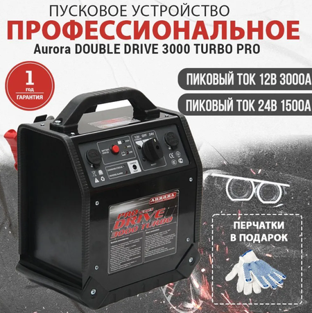 AURORA DOUBLE DRIVE 3000 TURBO профессиональная модель пускового устройства со встроенным аккумулятором! Запуск двигателей легковых и грузовых автомобилей! Такое устройство будет отличным приобретением для любого водителя "большой" машины! Прибор предназначен для запуска двигателей мотоциклов, легковых машин, грузовиков и прочей техники, для питания которых используется 12/24В аккумуляторы. Сможет запустить - мотоцикл, автомобиль, автобус, лодка, трактор, грузовик! Аппарат можно использовать как резервный источник тока во время замены АКБ, не опасаясь повредить электронику машины. Так же DOUBLE DRIVE 3000 TURBO будет незаменим в дороге, в качестве альтернативного источника энергии в нештатных ситуациях. Зарядка пускового устройства, может осуществляться от бортовой сети автомобиля, либо от сети 220В. Профессиональное исполнение гарантирует максимальную функциональность и продолжительную работу устройства в особенно тяжелых условиях! Пусковые Double Drive TURBO - запустим всё! >>> Полярный тест пускачей AURORA DOUBLE DRIVE >>> Особенности: Мощное устройство для запуска двигателей легковых и грузовых автомобилей! Запуск бензиновых и дизельных двигателей Выходные разъемы: 2х12В Встроенный аккумулятор Зарядка устройства от стационарной 220 В и бортовой сети автомобиля; Комплектация: силовые медные кабели 20 мм2, 1.05 м кабель прикуриватель-прикуриватель авто сетевой адаптер 220В/1000 мА Производство: Китай, Aurora/CARKU Гарантия: 1 год