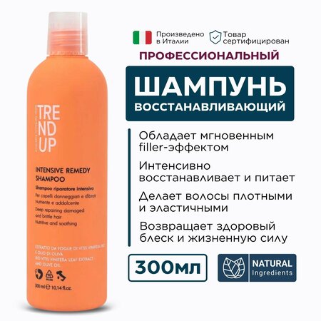 Шампунь TREND UP Intensive Remedy Shampoo разработан для бережного восстановления поврежденных и экстремально поврежденных волос. В составе содержится оливковое масло и растительный кератин, которые вместе работают для восстановления и оздоровления каждой пряди ваших волос. Благодаря специальной формуле шампунь создает мгновенный filler-эффект, наполняя и усиливая внутреннюю структуру волос, что делает их более плотными и здоровыми. – Растительный кератин оказывает регенерирующее, восстанавливающее, антиоксидантное и защитное действие. – Био-экстракт Vitis Vinifera (экстракт из листьев красного винограда) обладает высокими защитными, антиоксидантными и тонизирующими свойствами, придает волосам жизненную силу, делает их эластичными, гладкими и блестящими. – Olea Europaea Fruit Oil (оливковое молочко) не только обладает высокими антиоксидантными свойствами, но и интенсивно питает волосы, восстанавливая их естественную жизненную силу. Шампунь подходит для всех типов волос, особенно для поврежденных и экстремально поврежденных, нуждающихся в дополнительном питании и восстановлении: – для сухих и ломких волос – для окрашенных, истонченных и ослабленных волос – для волос, подвергающихся воздействию высоких температур (после применения термических инструментов), и химически поврежденных волос – для механически поврежденных волос (после использования заколок, резинок, после резкого расчесывания) Для достижения наилучшего результата применяйте шампунь в сочетании со средствами: – Спрей для поврежденных волос TREND UP Intensive Remedy Keratin Spray – Спрей-маска для ухода за волосами с экстрактом гамамелиса TREND UP All Benefit Bi-Phase