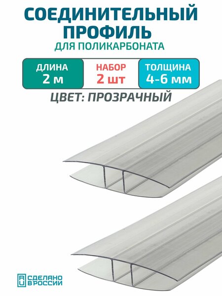 Профиль соединительный для поликарбоната 4-6 мм, длина 2 метра,2 шт. Прозрачный надежный и удобный элемент для герметичного соединения сотового поликарбоната.