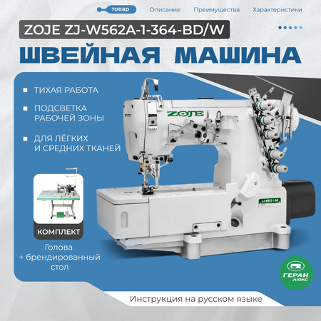ZOJE ZJ-W562-1-364-BD/W Трехигольная, пятиниточная плоскошовная промышленная машина цепного стежка с верхним раскладчиком и плоской платформой, с прямым позиционирующим, энергосберегающим приводом и электронной регулировкой скорости. Предназначена для обработки легких и средних материалов, в таких изделиях как: спортивная одежда, футболки, нижнее белье, при пошиве эластичных, трикотажных а также хлопчатобумажных тканей. Индустриальная машина ZOJE ZJ-W562-1-364-BD/W хорошо себя зарекомендовала благодаря невысокой цене и безупречному качеству при шитье на различных видах материалов. Встроенный прямой привод в головку машины обеспечивает тихий, мягкий ход, низкий уровень вибрации и шума и значительное энергосбережение. Плоскошовная машина ZOJE ZJ-W562-1-364-BD/W оснащена дифференциальным механизмом подачи материала, с возможностью тонкой регулировки и настройки на различные ткани и материалы. Машина ZOJE ZJ-W562-1-364-BD/W имеет централизованную систему смазки, оборудована встроенным светильником. Выполнена на базе PEGASUS. Характеристики товара