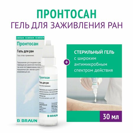 Пронтосан гель для ран - это готовый к применению стерильный водорастворимый гель для наружного применения, предназначенный для для очищения, увлажнения и деконтаминации раневых поверхностей. Гель обладает мощным антибактериальном действием, благодаря содержанию активных веществ - 0,1 % полиаминопропил бигуанид (полигексанид), 0,1% сурфактант (поверхностно-активное вещество). Он быстро и эффективно убивает бактерии и восстанавливает поврежденные ткани кожи, способствуя быстрому заживлению. Показания Для очищения и ускорения заживления ран.
