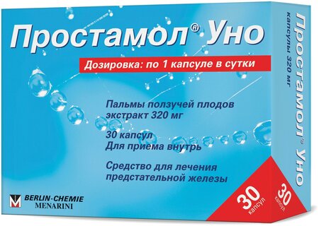 Экстракт плодов пальмы ползучей (Serenoa repens) оказывает антипролиферативный антиандрогенный, противовоспалительный, и противоотечный эффекты, которые избирательно проявляются на уровне предстательной железы. При этом препарат не оказывает влияния на уровень половых гормонов в плазме крови, не влияет на потенцию и либидо и не изменяет уровень простатоспецифического антигена в плазме крови.Местное антипролиферативное действие препарата проявляется снижением активности факторов роста (прежде всего эпидермального и фибробластического), торможением связывания рецепторов пролактина с последующим нарушением процессов передачи сигнала в клетки простаты и ускорением процессов апоптоза клеток простаты, что отражается в торможении роста объема предстательной железы.Механизм местного антиандрогенного действия обусловлен ингибированием синтеза дигидротестостерона из тестостерона (за счет угнетения фермента 5-альфа-редуктазы I и II типов) и его фиксации к цитозольным рецепторам клеток простаты, что препятствует проникновению гормона в ядро. В результате этого уменьшается синтез белка.Механизм местного противовоспалительного действия обусловлен тем, что экстракт плодов пальмы ползучей (Serenoa repens) ингибирует активность фосфолипазы А2, 5-липоксигеназы и высвобождение арахидоновой кислоты, тем самым уменьшает синтез простагландинов и лейкотриенов, которые являются медиаторами воспаления. Простамол® Уно уменьшает проницаемость капилляров и сосудистый стаз, уменьшает отечность и воспалительный процесс в простате, устраняет компрессию шейки мочевого пузыря и мочевыводящего канала, улучшая показатели уродинамики.Таким образом, препарат Простамол® Уно способствует, с одной стороны, уменьшению выраженности патологических симптомов доброкачественной гиперплазии простаты (дизурии, поллакиурии, никтурии, болезненных ощущений и чувства напряжения при мочеиспускании, неполного опорожнения мочевого пузыря), увеличению объема и силы мочеиспускания. С другой стороны, на фоне применения препарата замедляется дальнейший рост и увеличение объема предстательной железы.