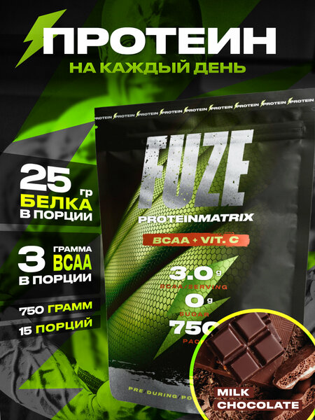 Протеиновый коктейль FUZE c BCAA для набора мышечной массы Мечтаете о рельефной фигуре и увеличении мышечной массы? Хотите поддерживать отличную физическую форму и здоровье? Тогда протеиновый коктейль Fuze – ваш идеальный выбор! Это высококачественный российский протеин без сахара, созданный специально для мужчин и женщин, стремящихся к достижению спортивных целей и активного образа жизни Сила и энергия в каждой порции, дополненная преимуществами BCAA аминокислот, включенных в его состав. БЦАА играют ключевую роль в росте и восстановлении мышц, снижают мышечную боль после тренировок и способствуют лучшему усвоению белка. Благодаря наличию BCAA в Фьюз протеине, Вы получите максимальную пользу от каждой тренировки, ускоряя прогресс на пути к желаемой фигуре. Преимущества Фьюз протеина Быстрый прирост мышечной массы: Каждая порция (50 г) содержит 25 г белка, обеспечивая эффективное наращивание мышц. Оптимальное количество углеводов поддерживает уровень гликогена в мышцах, необходимого для энергии во время интенсивных тренировок. Роль углеводов в наборе мышечной массы неоценима – достаточное их количество в рационе является обязательным условием для достижения желаемых результатов. Невероятный вкус и удобство: Насладитесь насыщенными вкусами шоколада или вишни без сахара. Сбалансированная формула: Уникальная протеиновая матрица (сывороточный белок, казеин, яичный белок, изолят соевого белка, пшеничный белок) обеспечивает комплексное питание мышц. Витамин С улучшает усвоение белка и укрепляет иммунитет. Высочайшее качество и российское производство: Мы используем только отборные ингредиенты и строго контролируем каждый этап производства, гарантируя безопасность и эффективность продукта. Идеально для всех: Fuze подходит как для мужчин, так и для женщин, стремящихся к увеличению мышечной массы и улучшению спортивных результатов. Отлично подходит для ПП (правильного питания). Рекомендации по применению Быстрое и легкое приготовление: смешайте 2 мерные ложки порошка с 300-400 мл воды или молока. Рекомендуется принимать 1-3 порции в день: между приемами пищи для поддержания уровня белка и сразу после тренировки для быстрого восстановления. Размешайте порошок в шейкере с молоком, водой или любым другим напитком. Состав на 1 порцию (50 г): Белки: 25 г Углеводы: 17 г Жиры: 2 г Калорийность: 190 ккал Fuze подходит как для мужчин, так и для женщин, стремящихся к увеличению мышечной массы и улучшению спортивных результатов. Отлично подходит для ПП (правильного питания) Гарантия качества Мы используем только лучшие ингредиенты и строго контролируем каждый этап производства, гарантируя безопасность и эффективность продукта. Наш состав подтвержден документами государственной регистрации и строго контролируется в рамках нашего производства. Мы уверены в качестве нашего продукта! Готовы достичь новых вершин в своей физической форме? Тогда не откладывайте – начните свой путь к идеальному телу с протеиновым коктейлем Fuze! Мы предлагаем вам не просто продукт, а надежного союзника в достижении ваших целей