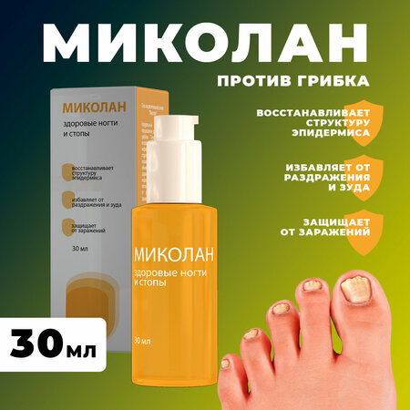 Противогрибковое средство "Миколан", флакон 30 мл Гель на растительной основе "Миколан" Натуральный гель предназначен для борьбы с грибком. Гель напрямую воздействует на источники инфекции, восстанавливает структуру эпидермиса и нормализует процессы обмена веществ в коже при заражении грибковыми инфекциями стоп, ногтей и пяток. Средство избавляет от раздражения и зуда, защищает от заражений. Это органический крем, который борется с грибковыми поражениями и инфекциями на коже и ногтях. Он быстро действует и имеет пролонгированный эффект, не вызывая привыкания и побочных действий. Миколан гель от грибка эффективно борется с грибком ногтей на ногах, который может легко распространиться и вызвать множество хронических заболеваний. Крем содержит органические вещества, которые уничтожают колонии патогенов и восстанавливают поврежденные ткани. Он так же увлажняет кожу и ногтевую пластину, купирует острые формы воспалительного процесса, устраняет неприятные ощущения и дискомфорт. Он полностью уничтожает, подавляет размножение и распространение спор и мицелиев грибка, ускоряет рост нового здорового ногтя и активно обновляет эпидермис. Миколан от грибка отшелушивает ороговевшие ткани, что способствует достижению заявленного производителем эффекта от курсовой терапии. Для этого достаточно строго следовать инструкции по применению. Миколан - это здоровье и красота ваших ног. Активные вещества крема обладают высоким процентом адсорбции на поверхности кожи и ногтя, обеспечивая моментальное впитывание и проникновение в очаг поражения.