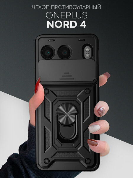 Этот противоударный чехол на Ван Плас (ВанПлюс) Норд 4 подарит вам ощущение защищённости и надёжности. Он изготовлен из пластика и силикона: благодаря сочетанию этих материалов чехол смягчает удары, оберегая телефон от повреждений, но при этом не трескается сам. Внешняя часть чехла пластиковая: этот материал не растягивается со временем и долго сохраняет свою первозданную эстетику. Внутренняя часть сделана из силикона, благодаря чему чехол плотно надевается, легко снимается и не царапает смартфон. Кейс сделан точно под ваш OnePlus Nord4 - в соответствии всем разъёмам и кнопкам, а потому садится как вторая кожа: плотно и без зазоров. В отличие от бамперов этот чехол-накладка надевается не только на боковые грани смартфона, но также и на заднюю часть, что обеспечивает тому надёжную защиту, а благодаря выступающим над дисплеем бортикам вы будете меньше переживать и за дисплей. Благодаря брутальному дизайну кейс не только привлекает внимание, но также и крепко сидит в руке и мягко защищает телефон. А металлическое кольцо заменит вам подставку, попсокет, а также металлические пластины для держателей, оставаясь при этом невероятно компактным. Кольцо магнитится к автомобильным держателям за счёт металла, поэтому не влияет на работу смартфона. А благодаря выдвижной шторке модулю камер теперь не страшны ни мелочь, ни ключи в карманах. Камеры всегда защищены, но если вам нужно сделать снимок - шторка отодвинется одним движением.