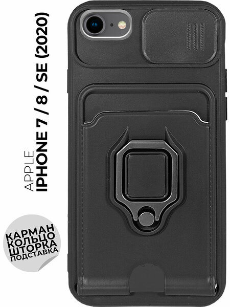 Противоударный чехол для Apple iPhone SE (2022) / SE (2020) / 8 / 7 с защитой камеры и карманом для платиковой карты обеспечивает полную защиту от царапин, ударов, падений и других повреждений. Защита камеры выполнена в виде подвижного окна — это надёжное решение для тех, кто ищет максимальную безопасность своего устройства. Задвижка обеспечивает дополнительную защиту объектива камеры от царапин и повреждений, а также позволяет легко открывать и закрывать камеру. Особенностью данного чехла является наличие отделения для хранения карт, что избавит вас от необходимости носить с собой лишний кошелек или искать место для карт в карманах. Бронированная накладка оснащена кольцом-держателем для пальца, которое убережет телефон от случайных падений или попыток кражи. Так же данное кольцо с легкостью превращается в удобную подставку, которую удобно использовать для просмотра видео, чтения электронных книг или общения в социальных сетях. В ударопрочный бампер встроена стальная пластина, благодаря которой чехол можно использовать с магнитным автодержателем. Это гарантирует безопасность вашего устройства во время движения и предотвращает его падение на пол. Чехол на Эпл Айфон СЕ 2022 / СЕ 2020 / 8 / 7 изготовлен из высококачественных материалов, которые обеспечивают долговечность и устойчивость к внешним воздействиям. Он также имеет стильный дизайн, который подчеркнёт индивидуальность вашего смартфона. Этот аксессуар станет прекрасным дополнением к вашему телефону. Вы можете выбрать чехол из различных цветов, чтобы соответствовать своему стилю и настроению. Он станет отличным подарком для любого пользователя смартфона и поможет сохранить ваше устройство в идеальном состоянии на долгое время. Черный чехол не только защищает ваш телефон от повреждений, но и придает ему элегантный и современный вид.