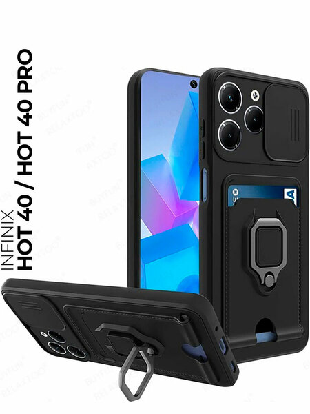 Противоударный чехол для Infinix Hot 40 / Hot 40 Pro с защитой камеры и карманом для платиковой карты обеспечивает полную защиту от царапин, ударов, падений и других повреждений. Защита камеры выполнена в виде подвижного окна — это надёжное решение для тех, кто ищет максимальную безопасность своего устройства. Задвижка обеспечивает дополнительную защиту объектива камеры от царапин и повреждений, а также позволяет легко открывать и закрывать камеру. Особенностью данного чехла является наличие отделения для хранения карт, что избавит вас от необходимости носить с собой лишний кошелек или искать место для карт в карманах. Бронированная накладка оснащена кольцом-держателем для пальца, которое убережет телефон от случайных падений или попыток кражи. Так же данное кольцо с легкостью превращается в удобную подставку, которую удобно использовать для просмотра видео, чтения электронных книг или общения в социальных сетях. В ударопрочный бампер встроена стальная пластина, благодаря которой чехол можно использовать с магнитным автодержателем. Это гарантирует безопасность вашего устройства во время движения и предотвращает его падение на пол. Чехол на Инфиникс Хот 40 / Хот 40 Про изготовлен из высококачественных материалов, которые обеспечивают долговечность и устойчивость к внешним воздействиям. Он также имеет стильный дизайн, который подчеркнёт индивидуальность вашего смартфона. Этот аксессуар станет прекрасным дополнением к вашему телефону. Вы можете выбрать чехол из различных цветов, чтобы соответствовать своему стилю и настроению. Он станет отличным подарком для любого пользователя смартфона и поможет сохранить ваше устройство в идеальном состоянии на долгое время. Черный чехол не только защищает ваш телефон от повреждений, но и придает ему элегантный и современный вид.