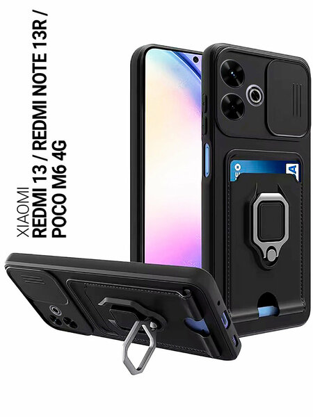 Противоударный чехол для Xiaomi Redmi 13 / Redmi Note 13R / Poco M6 4g с защитой камеры в виде окна-задвижки и карманом для пластиковой карты — идеальное решение для тех, кто хочет обеспечить максимальную безопасность своему смартфону. Задвижка надёжно закрывает объектив камеры, предотвращая появление царапин и повреждений, сохраняя качество снимков на высоком уровне. Особенностью данного чехла является наличие отделения для хранения карт, что избавит вас от необходимости носить с собой лишний кошелек или искать место для карт в карманах. Одним из главных преимуществ этого бронированного бампера с защитой камеры является его способность надежно защищать ваш смартфон от ударов и падений, благодаря чему ваш Сяоми Редми 13 / Редми Ноут 13Р / Поко М6 4г будет оставаться в идеальном состоянии даже при активном использовании. Кольцо-держатель превращается в удобную подставку, позволяет просматривать видео, читать электронные книги или общаться в социальных сетях с максимальным комфортом. Благодаря этому кольцу ваш смартфон защищен от случайных падений или попыток кражи. Встроенная стальная пластина служит для крепления магнитного автодержателя, который обеспечивает надёжную фиксацию смартфона в автомобиле. Это гарантирует безопасность вашего устройства во время движения и предотвращает его падение на пол. Высококачественные материалы и стильный дизайн делают эту ударопрочную накладку вашим верным спутником в любой ситуации. Она защитит ваш смартфон от ударов, падений и царапин, а также добавит элегантности вашему образу. Вы можете выбрать чехол, который отражает ваше настроение, интересы или хобби, делая ваш телефон уникальным и неповторимым. Не упустите возможность обновить свой телефон с помощью стильного и функционального чехла! Ваш гаджет будет выглядеть модно и аккуратно в черном чехле, а вы будете наслаждаться его комфортом и безопасностью!