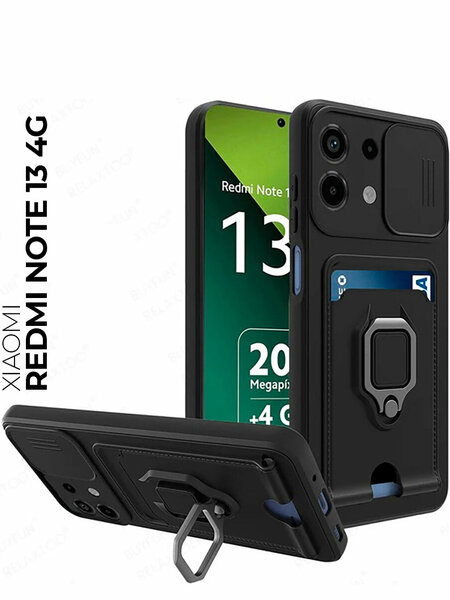 Противоударный чехол для Xiaomi Redmi Note 13 4G с защитой камеры и карманом для платиковой карты обеспечивает полную защиту от царапин, ударов, падений и других повреждений. Защита камеры выполнена в виде подвижного окна — это надёжное решение для тех, кто ищет максимальную безопасность своего устройства. Задвижка обеспечивает дополнительную защиту объектива камеры от царапин и повреждений, а также позволяет легко открывать и закрывать камеру. Особенностью данного чехла является наличие отделения для хранения карт, что избавит вас от необходимости носить с собой лишний кошелек или искать место для карт в карманах. Бронированная накладка оснащена кольцом-держателем для пальца, которое убережет телефон от случайных падений или попыток кражи. Так же данное кольцо с легкостью превращается в удобную подставку, которую удобно использовать для просмотра видео, чтения электронных книг или общения в социальных сетях. В ударопрочный бампер встроена стальная пластина, благодаря которой чехол можно использовать с магнитным автодержателем. Это гарантирует безопасность вашего устройства во время движения и предотвращает его падение на пол. Чехол на Сяоми Рилми Ноут 13 4Г изготовлен из высококачественных материалов, которые обеспечивают долговечность и устойчивость к внешним воздействиям. Он также имеет стильный дизайн, который подчеркнёт индивидуальность вашего смартфона. Этот аксессуар станет прекрасным дополнением к вашему телефону. Вы можете выбрать чехол из различных цветов, чтобы соответствовать своему стилю и настроению. Он станет отличным подарком для любого пользователя смартфона и поможет сохранить ваше устройство в идеальном состоянии на долгое время. Черный чехол не только защищает ваш телефон от повреждений, но и придает ему элегантный и современный вид.