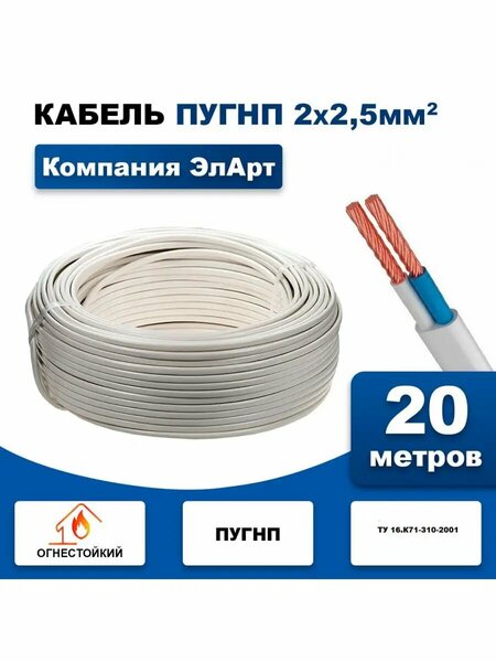 Провод ПУГНП 2х2.5 мм2, провод пугнп многожильный, силовой медный, кабель электрический. Медный ПУГНП кабель, для электрических соединений, для монтажных работ, для монтажа удлинителей и т. д. провод пугнп имеет высокую степень гибкости, справляется с серьезными механическими нагрузками. Самый просто и удобный кабель. Кабель плоской формы представляет собой 2 медные изолированные жилы с сечением 2.5 мм2 в оболочке из ПВХ пластиката. Соединительные работы следует проводить при температуре не ниже -15 градусов; эксплуатация изделия возможна в диапазоне от -25 до +40 градусов. Материалы провода обеспечивают высокое качество монтажа и гарантию надежной эксплуатации электроприборов в будущем. Данный провод электрический используют для удлинителей, для наращивания, такой кабель мягкий и гибкий, поэтому легко монтируется. Известен под такими названиями как: Кабель ПУГНП, Провод ПУГНП, многожильный медный провод, кабель силовой, кабель для освещения, кабель электрический пугнп, провод белый.