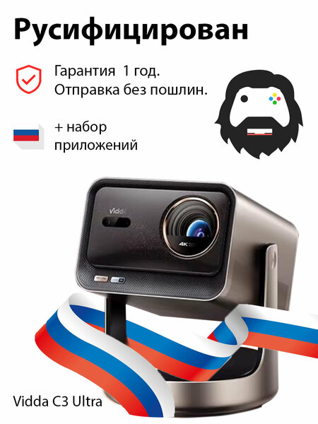 Vidda C3 Ultra подготовлен к российским реалиям, установлен российский лаунчер, все основные сервисы: Кинопоиск, ВК видео, Rutube, Youtube, Lampa. Есть возможность бесплатного онлайн просмотра фильмов и сериалов. Меню настроек на 95% переведено на английский (5% иероглифов в неиспльзуемых частях меню). Основные особенности: 1. Оптический зум. 0,9-1,5 Это значит что при расстоянии от экрана до проектора например в 3м вы получите картинку шириной от 3/1,5=2м до 3/0,9=3,33м шириной без обрезки пикселей и потери качества 4k. 2. Яркость 3200 CVIA люмен, контрастность 2000:1, 110% покрытия цветового пространства. Позволяет с 4-5м получить картинку на всю стену от пола до потолка. 3. Встроенный сабвуфер с акустикой JBL дает максимально реалистичное звучание из коробки, позволяет возить с собой, не подключая внешнюю акустику. Комплектация: Проектор. Пульт дистанционного управления. Кабель питания с переходником на евро розетку Инструкция. Каждый проектор дважды проверяется на работоспособность. 1 раз в Китае при получении с завода Hisense, второй раз в России при установке приложений и русского лаунчера.