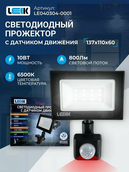 Прожектор светодиодный 10Вт с датчиком движения, IP65, для внутреннего и наружного освещения дворов, подьездов, охраняемых территорий, влагостойкий, LEEK