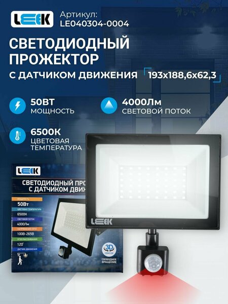 Прожектор светодиодный 50Вт с датчиком движения, IP65, для внутреннего и наружного освещения дворов, подьездов, охраняемых территорий, влагостойкий, LEEK