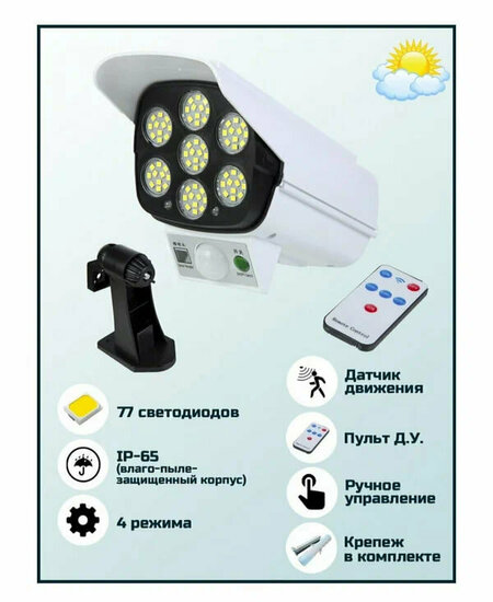 Прожектор муляж видео камеры Прожектор уличный 2 в 1, беспроводной, с зарядкой от солнца, с датчиком движения, всепогодный, влагостойкий с управлением от пульта ДУ. Муляж работающей видеокамеры (моргает красный светодиод), при обнаружении движения, загорается прожектор и горит примерно 15-30 секунд. Не требует прокладки проводов, работает от солнечной энергии. При первом использовании поместите изделие в солнечное место для зарядки в течении нескольких часов. Рекомендуемая высота установки 2-3 метра. Зимой рекомендуется использовать режим 1. Характеристики: Материал: АВС пластикКоличество светодиодов: 77Аккумулятор встроенный: 18650 LionЁмкость аккумулятора: 2400мАчВремя зарядки днём: 6ч. Время работы: 8ч. Водозащита: IP65Дистанция срабатывания датчика движения: 5мРежимы работы:1. Фонарь включается на 15-30сек при срабатывании датчика движения.2. Фонарь включается на 15-30сек на 100% при срабатывании датчика движения, затем горит на 25% постоянно.3. Фонарь горит постоянно на 25%.