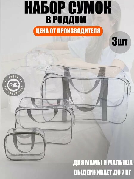 Комплект сумок в роддом прозрачные от бренда "золотой октябрь" из прочного водонепроницаемого, безопасного ПВХ материала для мамы и малыша без наполнения. Соответствует требованиям в родильных домах. С данным набором, будущие мамы могут быть спокойны и уверены в безопасности материалов. В набор входит 3 прозрачные сумки с модными актуальными расцветками. Характеристики набора: Широкие ручки прозрачной сумки выполнены из прочного текстиля. Большая сумка для мамы - для одежды и аксессуаров, каркас прозрачной сумки для роддома надежно и крепко усилен стропами; средняя сумка для малыша - небольшие вещи и предметы гигиены; прозрачная косметичка несессер; Молния прочная. Размеры: большая сумка 54х33х24- выдерживают вес до 6 кг, средняя сумка 32х23х17, косметичка 21х17х7. Наши Преимущества: На рынке более 10 лет! Зарекомендовали себя как надежный и качественный Российский производитель! Сумка прозрачная в роддом изготовлена из сертифицированной пленки ПВХ, соответствует санитарным нормам Минздрава. Прозрачная сумка в роддом готовая и разрешена во все роддома. Содержимое сумки всегда видно, что позволяет найти любую вещь; Влагостойкая, легко мыть. Возможно дальнейшее использование в быту: Сумка для хранения игрушек, косметичка, органайзер для одеял, подушек, дорожная сумка для путешествий, сумка в бассейн и фитнес, сумка на пляж, шоппер, сумка для документов, детский набор, подарок жене. внимание! Материал ПВХ имеет специфический запах, поэтому перед первым применением рекомендуем промыть в теплой воде и просушить на свежем воздухе, более вы ничего не почувствуете. Ознакомиться с полным ассортиментом можно в нашем магазине, нажав на логотип.