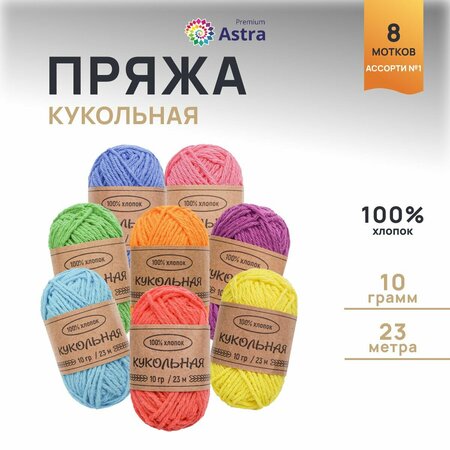 Пряжа Кукольная от торговой марки Astra Premium идеально подходит для вязания одежды для кукол и игрушек. Из хлопковой пряжи можно создать удивительные вещи для мини-гардероба: ажурные юбки, яркие платья, очаровательные панамки и стильные береты. Пряжа Кукольная изготовлена из качественного 100% хлопка. Нить классической крутки, равномерная по всей длине, полотно не растягивается и не деформируется при эксплуатации. Пряжа дает возможность создания аккуратных рядов и ровно распределяется в узоре. Яркие цвета пряжи не тускнеют на солнце и прекрасно переносят стирку. Готовая кукольная одежда из этой пряжи прочная и долговечная, почти не деформируется и приятная на ощупь. Отлично подходит для вязания спицами и крючком. В одной упаковке 8 миниатюрных разноцветных мотков. В одном мотке 10 г и 23 м пряжи. Рекомендуемые спицы/крючок: 4-5 мм. Толщина нити: средняя. Цена за 1шт