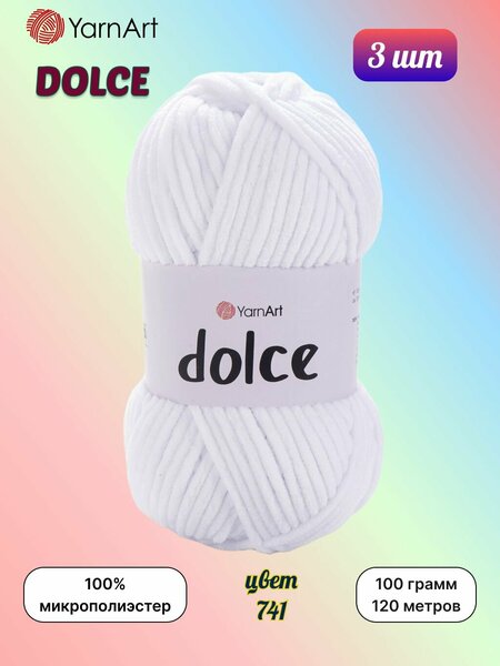 Пряжа YarnArt Dolce (дольче) – это очень мягкая плюшевая пряжа, состоящая из 100% микрополиэстера, созданная для вязания игрушек и изделий для детей. Пряжа очень приятная пряжа на ощупь, не скатывается, не деформируется в процессе эксплуатации, хорошо держит форму. Стоит отметить, что у данной пряжи богатая палитра цветов, каждая рукодельница непременно найдет то, что нужно среди разнообразия оттенков. Вы получите удовольствие от результата вязания, так как нить не скользит и не скручивается. Прекрасно подходит для вязания детских вещей, игрушек и брелков. Сама нить имеет толщину 5-6 мм, что позволит создавать объемные изделия. Состав: 100% микрополиэстер. Вес мотка 100 грамм, длина нити в мотке 120 метров. Производитель рекомендует спицы №4,5 и крючок №6,5. Оттенок пряжи может незначительно отличаться от представленных на фотографиях. Это зависит от партии товара, настроек монитора и освещения.