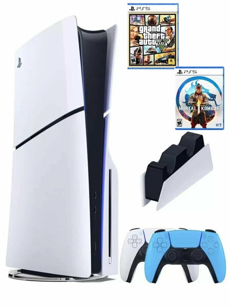 PS5 (ПС5) Sony PlayStation 5 Slim disk + 2-й геймпад(голубой) + зарядное + 2 игры GTA 5 + Mortal Kombat 1, 1000 Gb