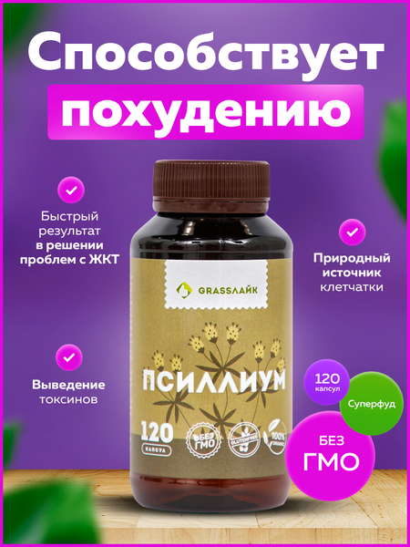 Псиллиум в капсулах - это инновационное пищевая добавка, которая поможет вам контролировать состояние пищеварительной системы и решить проблемы ЖКТ. Psillium - это натуральная растворимая клетчатка, получаемая из шелухи семян подорожника, которая известна своими важными очищающими свойствами для человека. Очищение организма важная процедура, которую нельзя игнорировать в современном мире. Детокс всегда был актуальным на протяжении многих лет. Клетчатка, содержащаяся в псиллиуме, является растворимым волокном, которое обладает способностью поглощать воду и образовывать гель в желудке. Это улучшает перистальтику кишечника и облегчить процесс пищеварения. Кроме того, шелуха семян подорожника способствует очищению организма от токсинов и шлаков, и стабилизирует его здоровье. Если использовать порошок для похудения, то можно не достичь натуральности от эффекта и навредить себе, псилиум помогает избежать этого и направить тело на правильную диету, соответствующую всем нормам здорового питания. Псиллиум в капсулах GrassЛайк предлагает удобный способ получения всех пользующихся известностью свойств, которая имеет растворимая клетчатка. Просто принимайте продукт ежедневно в соответствии с рекомендациями на упаковке, и вы будете получать максимальную пользу от псиллиума. Порошок для похудения отличается от псилума тем, что имеет более мягкий и комфортный метод детокс воздействия на тело. Псиллиум, является идеальным решением для тех, кто поддерживает нужный рацион и хочет улучшить работу ЖКТ. Он помогает справиться со сложностями, такими как запоры, не регулярное пищеварение и неудобства в желудке. Psillium также способствует контролю аппетита и может быть полезен для похудения, так как его потребление создает ощущение сытости. Не упустите возможность приобрести псилиум в капсулах и включить его в свой ежедневный рацион здорового питания. Ощутите преимущества этого естесственного и сбалансированного питательного дополнения меню, которое поможет вам достичь оптимального здоровья и поддерживать вашу пищеварительную систему в отличном состоянии, а также навсегда забыть о дискомфорте желудочно-кишечного тракта.