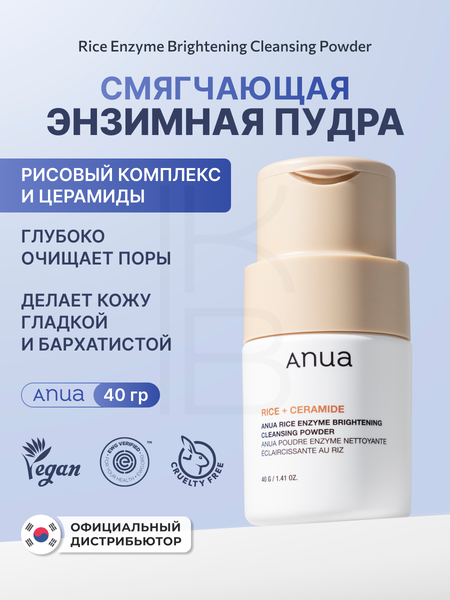 Энзимная пудра Anua Rice Enzyme Brightening Cleansing Powder очищает поры и полирует рельеф, придаёт ровный тон и сокращает видимость пигментации. Средство предотвращает образование комедонов и устраняет жирный блеск за счёт отшелушивания рогового слоя. Смягчает огрубевшие участки, делает кожу гладкой и нежной. Продукт можно использовать в качестве смываемой маски для дополнительного очищения, осветления и выравнивания тона. Для этого смешайте энзимную пудру с водой в пропорции 1:1 до образования тягучей консистенции маршмэллоу и оставьте маску на коже на 3-5 минут. Для чувствительной и обезвоженной кожи вместо воды рекомендуется использовать молочный тонер Anua Rice 70 Glow Milky Toner. Не вызывает раздражения, не содержит искусственных ароматизаторов. Основные действующие компоненты: