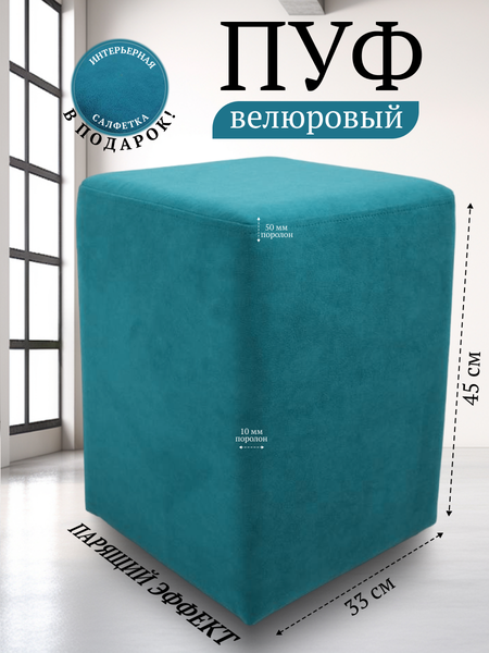 Пуфик в прихожую квадратный это стильный и функциональный предмет мебели, который идеально впишется в любой интерьер, будь то гостиная, спальня или детская комната. Может быть украшением офиса, студии, салонов или примерочных в качестве декора или для комфорта посетителей. Материал обивки антивандальный велюр премиум-класса, который отличается прочностью, долговечностью и простотой в уходе. Разнообразие оттенков, позволит подобрать пуфик как дополнение к любой мебели и к любому уголку дома, квартиры или дачи. Квадратная форма обеспечивает удобство использования и эргономичность. Компактный размер позволит установить его в небольших помещениях – в коридоре, на балконе, на лоджии, в гардеробной или на террасе. Высота вместе с опорными ножками составляет 45 см, ширина и глубина 33 см. Вес 3 кг. Каркас пуфа имеет покрытие из пенополиуретана - это мебельный поролон, который придает мягкость изделию, имеет амортизирующее свойство и прекрасно держит форму. Сбоку толщина поролона составляет 10 мм. Сверху 50 мм. Края скругленные, с ровной отстрочкой, которая подчеркивает контуры, фиксирует и гарантирует стабильность сиденья. У пуфа нет острых углов, что обеспечивает безопасность при эксплуатации, а также подчеркивает безупречность исполнения. Можно использовать как дополнительное место для сидения, или как опору для ног после долгого дня. Это идеальное решение в спальне возле туалетного или косметического столика, либо в кабинете, для выполнения недолгой работы. В небольшом коридоре – для комфортной смены обуви либо для временного размещения личных вещей. Пуф в прихожую - отличный подарок друзьям, родным и близким, на новоселье, годовщину свадьбы, День рождения, Новый год. Пуфик квадратный станет не только практичным дополнением прихожей, но и стильным акцентом в оформлении дизайна.