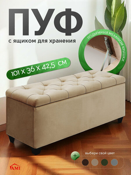 Пуфик банкетка от Ami - это современное, удобное и функциональное решение для вашего дома или офиса. Благодаря своей универсальности, модель можно использовать в прихожей, коридоре, гостиной, спальне или детской комнате. Дизайн прикроватной банкетки выполнен в стиле лофт, что делает ее отличным дополнением к любому интерьеру. Обивка стильного цвета придает пуфику мягкость и уют, а износостойкая и прочная ткань обеспечивает долговечность и простоту ухода. Пуф для ног оснащен удобным сиденьем и ящиком для хранения, что делает его многофункциональным предметом мебели. Под сиденьем находится вместительный короб, который подойдет для хранения вещей, аксессуаров, обуви и других домашних принадлежностей. Крышка с подъемным механизмом и доводчиками обеспечивает плавное опускание и защиту от резкого захлопывания. Каркас кресла изготовлен из надежных материалов, что гарантирует его прочность и устойчивость к повышенным нагрузкам. Ножки банкетки достаточно крепкие и устойчивые. Вместительная и удобная, она обеспечивает порядок и организованность в вашем пространстве, например, у туалетного столика. Представленная модель от нашего бренда станет отличным подарком для взрослых и детей на любой праздник и без повода. Это отличный выбор для тех, кто ценит комфорт, функциональность и стиль. Порадуйте себя нашим удобным и практичным аксессуаром мебели!