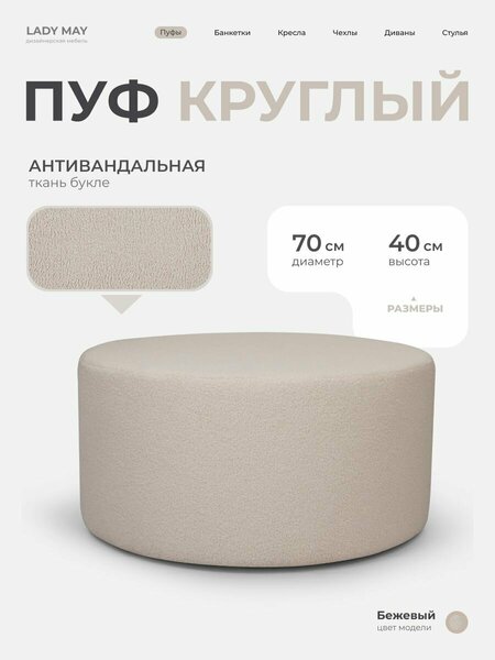 Уютный и стильный пуфик круглой формы - идеальное решение для вашей прихожей. Этот мягкий пуфик не только прекрасно впишется в интерьер, но и станет удобным дополнением к туалетному столику. Пуфик также может использоваться как банкетка в прихожую, обеспечивая комфорт и уют. Букле — это материал с высокой износостойкостью, что делает его идеальным для мебели, которая подвергается частому использованию. Он также обладает отличными теплоизолирующими свойствами, что делает пуф комфортным в любое время года. Кроме того, он легко чистится и устойчив к пятнам, что делает его подходящим для использования в семьях с детьми или домашними животными. Погрузитесь в атмосферу расслабления и комфорта с пуфиком "LADY MAY"!