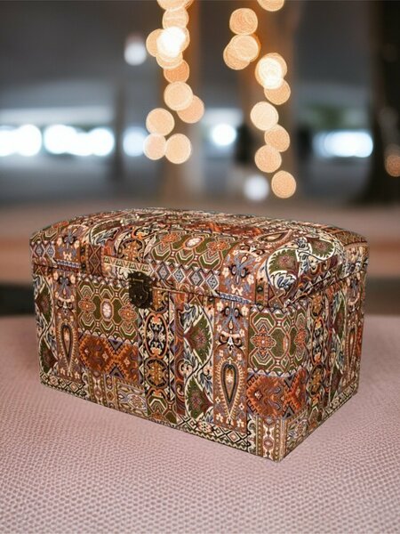 Представляем вам восточный сундук в виде пуфик с ящиком для хранения, который станет не только функциональным предметом мебели, но и ярким акцентом в вашем интерьере. Опытные мастера с тонким чувством восточной эстетики создали этот пуфик с любовью и вниманием к каждой детали. Обивка из гобелена в коричневом цвете придает ему особую изысканность и уютную атмосферу. Благодаря своей удобной форме и прочной конструкции, пуфик может использоваться как банкетка или обувница, а также служить удобным местом для сидения. Его универсальность идеально подходит для разных помещений: от прихожей до гостиной и спальни, а также для детской комнаты. Вы сможете наслаждаться комфортным отдыхом, сидя на этом пуфике, и при этом иметь все необходимые вещи под рукой в просторном ящике. А декоративный замок, украшенный изящными орнаментами, придает ему изюминку и делает его идеальным подарком для близких. Выбирая наш восточный пуфик с большим ящиком, вы получаете не только красивую и удобную мебель, но и частичку восточной культуры, которая обязательно порадует вас и ваших гостей. Не упустите возможность добавить в свой интерьер элегантность и функциональность с этой банкеткой! Такая мебель станет отличным подарком маме, бабушке, любимой девушке. А роскошные эксклюзивные сундуки могут стать оригинальным подарком на свадьбу, Новый Год 23 февраля, 8 марта Большой Пуф станет полезным дополнением вашего интерьера. Весь ассортимент нашего производства можно нажав на логотип нашей компании в карточке товара (кленовый листок). Сделано в России. Благодаря высококачественным материалам пуфики, банкетки прослужат долго и сохранят первоначальный вид. ! Если вы при распаковке сундука не увидели на нем замка, значит он лежит внутри во избежание его порчи при доставке. Там же находится инструкция по его установке.