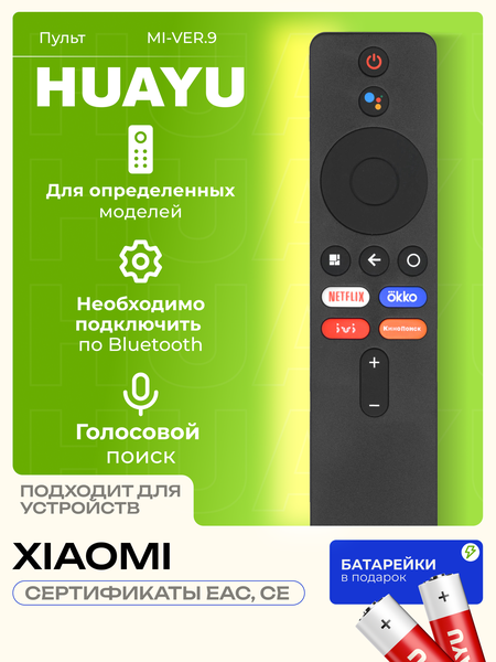 Голосовой пульт дистанционного управления HUAYU MI-VER.9 (XMRM-M3) для телевизоров, ресиверов и приставок XIAOMI / сяоми / ксиаоми! Пульт ДУ работает по Bluetooth и для его корректной работы необходимо произвести сопряжение с телевизором или ресивером по инструкции представленной на дополнительном фото товара. ПДУ подходит для замены моделей пультов XMRM-00A, XMRM-OOA, XMRM-006, XMRM-010, XMRM-M6. Список некоторых поддерживаемых моделей устройств: MDZ-24-AA, L32M6-6ARG, L55M6-ESG, TV, P1, 50, L55M6-ARG, Mi, Stick, L50M6-6ARG и другие. MI-VER.9 произведен в соответствии с высокими мировыми стандартами качества и безопасности, что подтверждается соответствующей сертификацией товаров HUAYU и станет прекрасной заменой сломанного или утерянного пульта.