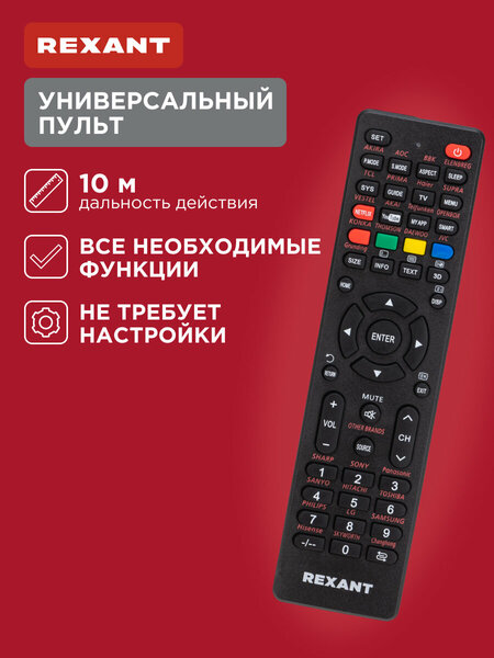 Универсальный пульт дистанционного управления REXANT представляет собой удобное решение для управления большинством современных телевизоров различных марок. Он совместим с широким спектром производителей, включая VESTEL, GRUNDIG, SHIVAKI, AKIRA, DAEWOO, KONKA, PRIMA, JVC, THOMSON, HISENSE, TCL, SHARP, SONY, PANASONIC, SANYO, HITACHI, TOSHIBA, PHILIPS, LG, SAMSUNG, ERISSON, FUNAI, CHANGHONG, AIWA, и SKYWORTH.