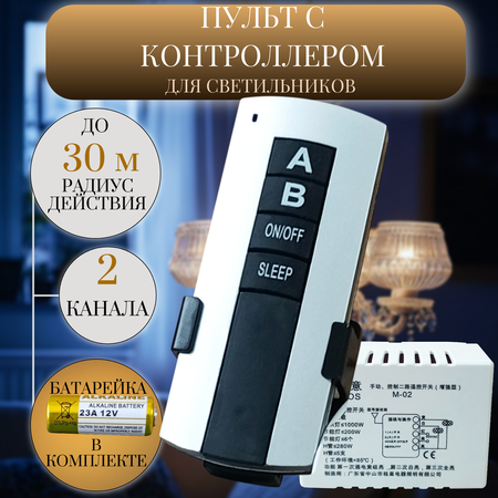 Дистанционно управляемый выключатель люстр на 2 канала предназначен для управления светильниками и другими электроприборами без применения стационарных выключателей. В комплект входят: двухканальный контроллер, пульт дистанционного управления с держателем и элемент питания для пульта типа А23. Контроллер оснащен антенной и четырьмя проводниками для соединения с электрической сетью и источниками света. Пульт оснащен четырьмя кнопками управления. ПДУ и контроллер запрограммированы на одну общую частоту с зашифрованным радиосигналом. Это технология исключает управление контроллером с других аналогичных пультов и позволяет устанавливать в одном помещении несколько контроллеров. Изделие позволяет управлять двумя автономными каналами освещения. Характеристики: Рабочее напряжение: 220 В. Максимальная нагрузка: 800 Вт. Дальность действия ПДУ: 30 м.