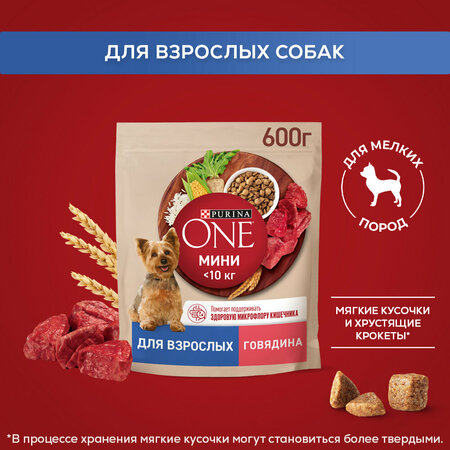 Сухой корм Purina ONE® мини для взрослых собак мелких пород с говядиной и с рисом, 600 г