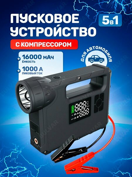 пусковое устройство для автомобиля портативное c компрессором — незаменимое устройство для автомобиля. Подходит для запуска машин. Также выполняет роль фонарика и насоса с давлением 150 PSI. Совместимо с дизелями до 3.0 литров и бензиновыми моторами до 4.0 литров. Выходное напряжение — 12v. Портативный автостартер с фонариком (SOS, светодиодный, стробоскоп, чтение). Емкость 16000 mah, дисплей с уровнем заряда и напряжения, режим индикации давления шин. Максимальный пиковый ток 1000 А для быстрого старта аккумулятора.