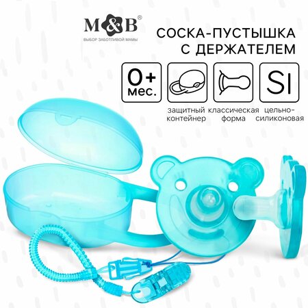Соска - пустышка цельносиликоновая классическая «Мишка», от 0 мес, с держателем, в контейнере, цвет зеленый, Mum&Baby