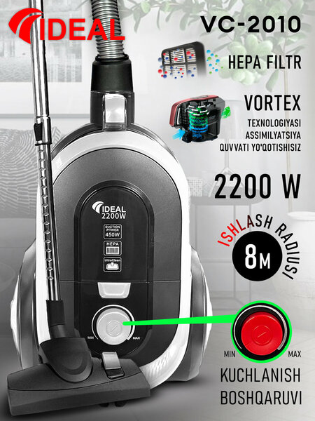 Пылесос Ideal VC-2010 - это мощный и эффективный помощник в уборке вашего дома. Пылесос оснащен мощным двигателем на 2200 Вт, что обеспечивает высокую мощность всасывания 450 Вт. Это позволяет эффективно собирать пыль и грязь с различных поверхностей, включая ковры и мягкую мебель. Емкость пылесборника составляет 2 литра, что позволяет использовать пылесос в течение длительного времени без необходимости его очистки. Уровень шума пылесоса составляет всего 82 дБ, что делает его работу практически бесшумной. Это позволяет использовать его даже в ночное время, не мешая сну. Пылесос оснащен HEPA фильтром, который обеспечивает высокую степень очистки воздуха от пыли и аллергенов. Это особенно важно для людей с аллергией или чувствительным дыханием. Рабочий радиус пылесоса составляет 8 метров, что позволяет охватить большую площадь за один проход. Пылесос оснащен автоматической смоткой шнура, что делает его хранение и транспортировку более удобными. В комплект пылесоса входят различные насадки, такие как щетка Ultra Clean для пыли, щелевая насадка и щетка для чистки мягкой мебели. Это позволяет использовать пылесос для уборки различных поверхностей и труднодоступных мест. Пылесос изготовлен в Узбекистане по турецким технологиям и имеет гарантийный срок 3 года.