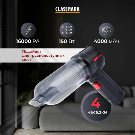 Автомобильный пылесос беспроводной мощный аккумуляторный Classmark WJ23081708, 150Вт, мощность всасывания 16000Па, ручной автопылесос для салона и багажника в машину, портативный