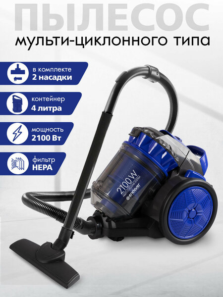 Пылесос циклонного типа Endever Skyclean VC-560, черный/синий, 2100 Вт, мощность всасывания 400 Вт, прозрачный пылесборник с увеличенным объемом 4 Л, постоянно-высокая мощность всасывания, кнопка автосмотки шнура, универсальная щетка, две пластиковые трубы, насадка для мебели и щелей, гибкий шланг в комплекте Энергоэффективность: Класс А 30 кВтч/г Инновационное строение корпуса и фильтров, минимизирующее уровень шума Индикация заполнения пылесборника Стильный дизайн Система фильтрации-фильтр мульти + HEPA-фильтр, фильтр защиты двигателя Вертикальная парковка щетки