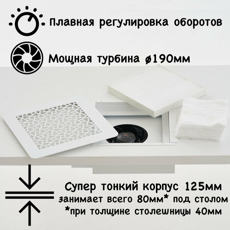 Пылесос имеет самый тонкий корпус среди конкурентов и почти не занимает место под столом, что очень здорово - так как для ног мастера останется много свободного места, высота блока с вентилятором и фильтрами всего 125мм (из них под столом пылесос будет занимать места в среднем не больше 9см!). Большую часть этого пространства занимает мощная турбина диаметром 190мм, которая создаёт сильное разрежения воздуха под блоком фильтров, что обеспечивает потрясающую мощность всасывания пыли. На столе у Вас будет стильная решетка, подняв которую Вы сможете легко получить доступ к фильтрам. Пылесос оснащен регулятором оборотов, для максимального удобства и выбора требуемой мощности для проводимых процедур! Для установки пылесоса нужно вырезать в столешнице отверстие по шаблону и просто вставить пылесос в подготовленное отверстие. Что может быть проще! Толщина фильтра тонкой очистки 25мм, что создаёт дополнительную рабочую площадь фильтрующего материала, тем самым улучшает проходимость воздуха и ресурс фильтра. Материал подобран таким образом, что пыль будет скапливаться в "складках" гармошки, а не в порах материала, что позволит использовать его повторно много раз после очистки. Вентилятор пылесоса изготовлен в КНР по лицензии Швейцарского производителя, он предназначен для промышленных вентиляционных систем поэтому имеет значительный срок службы в 40 000 часов (производитель указывает на то, что подшипники не требуют обязательного обслуживания в течении срока службы, а это более 5 лет). Благодаря точной балансировке вентилятора, он не создаёт лишнего шума и вибраций, что особенно актуально при проведении маникюра. Система фильтров дополнительно снижает уровень шума и в реальных условиях над столом уровень шума будет еще ниже.
