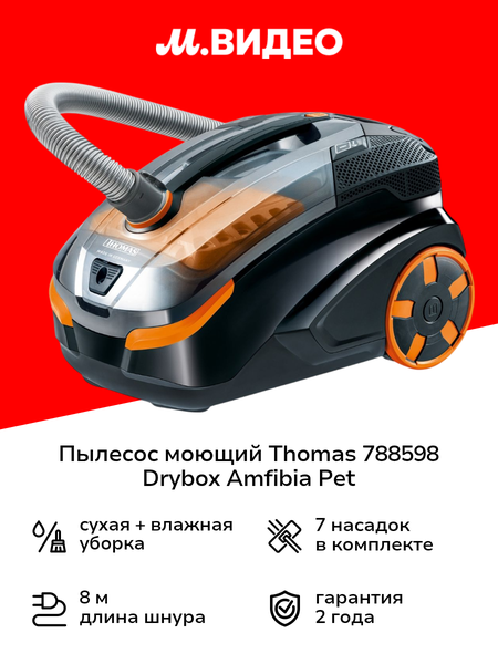Моющий пылесос Thomas 788598 Drybox Amfibia Pet предназначен в первую очередь для владельцев домашних животных. Он отлично собирает шерсть, устраняет следы и пятна, оставленные вашими питомцами не только на полу, но и на мягкой мебели. Для этого в комплект входят дополнительные насадки. просто И удобно Устройство работает по циклонической технологии. Загрязнения попадают в контейнер и разделяются пофракционно, на крупные и мелкие. Когда ёмкость заполнится, вы можете вытряхнуть мусор и аккуратно промыть боковые отделы, предназначенные для мельчайших летучих частиц. сухая уборка С аквафильтром Вы можете вообще обойтись без пылесборника. Залейте в контейнер воду, а когда наведёте чистоту в помещении, вылейте её со всем, что в неё попало в процессе. простая регулировка Несложная система управления позволяет найти мощность всасывания под конкретный тип покрытия. Вам доступны четыре режима и индикация-подсказка, помогающая быстро сделать выбор.
