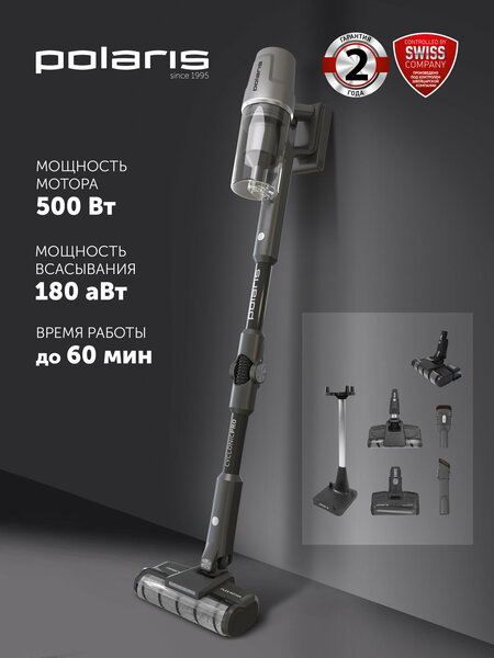 Беспроводной вертикальный пылесос с турбощеткой и 4 дополнительными насадками станет верным помощником в заботе о доме. Он легко превращается в компактный ручной пылесос, а при помощи сгибающейся трубы он легко достанет до самых труднодоступных мест. Моющая насадка поможет освежить полы после сухой уборки или же убрать локальные загрязнения на полу в прихожей или на кухне. Мощной инвенторный мотор 500 Вт обеспечит непрерывную работу прибора до 60 минут, на сам мотор действует расширенная гарантия 10 лет! Технология Cyclonic Smart увеличит время работы пылесоса от одного заряда, подбирая необходимую мощность всасывания в зависимости от степени загрязнения. Компактное хранение благодаря напольной подставке с держателями для насадок. Технология Cyclonic Smart – автоматическое изменение мощности всасывания в зависимости от степени загрязнения в режиме «авто» Технология Flex Motion – свобода движения 360о во время уборки благодаря сгибающейся трубе и особой конструкции турбощетки Технология Walk by itself - благодаря особому электроприводу на щетке пылесос сам устремляется вперед, его вес практически не ощущается при использовании на горизонтальных поверхностях. Сухая и влажная уборка Мощность 500 Вт Мощность всасывания – 180 аВт Емкость аккумулятора – 2500 мАч. Время работы без подзарядки: до 60 минут. Режимы мощности: авто, эко, максимальный. Время зарядки аккумулятора – 4 часа LED дисплей показывает статус работы и уровень заряда батареи Макс. уровень шума - 72 дБ Доп. аксессуары: щелевая насадка, насадка 2 в 1, мини турбощетка, насадка для влажной уборки, настенное крепление, напольная подставка Объем контейнера для пыли: 0,4 л Объем насадки для влажной уборки: 0,2 л Гарантия: 2 года Зарядное устройство: - Входное напряжение: 100-240 В; - Частота: 50/60 Гц; - Выходное напряжение: 30 В; - Выходной ток: 0,6 А.