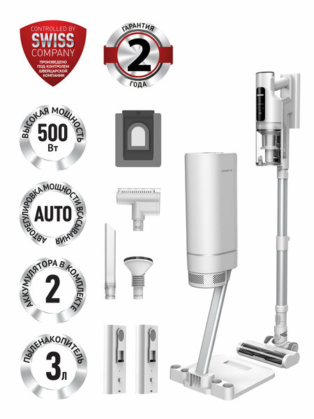 Беспроводной вертикальный пылесос с пыленакопителем надолго избавит от необходимости очищать контейнер для пыли, ведь автоматический пыленакопитель быстро и без остатка собирает пыль в специальный герметичный мешок объемом 3 литра, надолго обеспечивая чистоту. Встроенная УФ-лампа в пыленакопителе нужна для обеззараживания собранного мусора. Сам пыленакопитель одновременно является зарядной базой для вертикального пылесоса, а также обладает изящным дизайном и отлично впишется в интерьер. Мощный инвенторный мотор 500 Вт обеспечит непрерывную работу прибора до 60 минут, а второй аккумулятор в комплекте поможет удвоить это значение! LED дисплей показывает статус работы и уровень заряда батареи, а специальный индикатор на пыленакопителе предупредит о необходимости заменить мешок для пыли. Универсальная турбощетка уникальной структуры с лазерной подсветкой пыли и защитой от наматывания волос справится даже с сильными загрязнениями, а мини турбощетка и дополнительные насадки помогут очистить мягкую мебель и труднодоступные места. В режиме «авто» пылесос сам подбирает необходимую мощность всасывания в зависимости от степени загрязнения, тем самым увеличивая время работы от одного заряда. Телескопическая труба пылесоса подстроится под рост для комфортного использования устройства во время уборки. В комплекте 3 мешка для пыли. Технология Cyclonic Smart – автоматическое изменение мощности всасывания в зависимости от степени загрязнения в режиме «авто» Технология Walk by itself - благодаря особому электроприводу на щетке пылесос сам устремляется вперед, его вес практически не ощущается при использовании на горизонтальных поверхностях. Мощность 500 Вт Мощность всасывания – 170 аВт Емкость аккумулятора – 2500 мАч. Время работы без подзарядки: до 60 минут. Режимы мощности: авто, эко, средний, сильный. Время зарядки аккумулятора – 3 часа LED дисплей показывает статус работы и уровень заряда батареи. Автоматический пыленакопитель 3 л. Макс. уровень шума - 76 дБ Доп. аксессуары: круглая насадка, насадка 2 в 1, мини турбощетка, 3 мешка для пыли, запасной HEPA фильтр, 2 аккумулятора. Объем контейнера для пыли: 0,65 л Гарантия: 2 года Зарядное устройство: - Входное напряжение: 100-240 В; - Частота: 50/60 Гц; - Выходное напряжение: 34,2 В; - Выходной ток: 1,0 А.