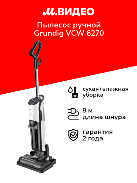 Вертикальный моющий пылесос Grundig VCW 6270 наделен функциями сухой, влажной и паровой уборки. Прибор мощностью 1800 Вт получает электропитание от сети 220 В, радиус его действия составляет 8,3 метров. Для сбора мусора предусмотрены съемный контейнер объемом 0,48 л, резервуары для чистой (0,55 л) и грязной (0,48 л) воды. Жидкость подается к щеточному валику, который вращается от двигателя мощностью 1800 Вт. Функцию распыления воды можно отключить. При глубокой очистке возможно использование высокотемпературного пара. Электронный модуль управления на рукоятке позволяет выбирать режим обработки, регулировать уровень подачи жидкости. Многоступенчатая система фильтрации включает аквафильтр класса Н10, микрофильтр, моторный фильтр, сменный выходной фильтр, ионообменный фильтр бака пресной воды. Уровень шума во время уборки не превышает 84 дБ. После работы прибор устанавливают на станцию самоочистки, которая выполняет функцию парковочного места, сводит к минимуму взаимодействие с очисткой контейнера-пылесборнника. Предусмотрена индикация подачи пара, заполнения пылесборника, блокировки щеточного валика, самоочистки.