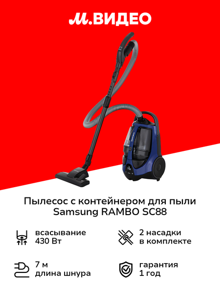 Пылесос с контейнером для пыли Samsung SC885B обладает мощностью 2200 Вт. Прибор снабжен сетевым кабелем длиной 7 м, который автоматически сматывается внутрь корпуса. Устройство укомплектовано двумя насадками: универсальной 3 в 1, используемой для чистки мягкой мебели и удаления загрязнения из щелей, и стандартной для пола и ковров. Управление обеспечивает блок с механическими кнопками, расположенными на ручке. Пылесос оборудован металлической телескопической трубкой. Переносить и парковать устройство можно вертикально и горизонтально. Эта модель оснащена ручкой и большими колесами. Samsung SC885B собирает мусор в двухкамерный циклонический контейнер объемом 2 л. Конструкция отличается долгим сохранением силы всасывания, в отличие от традиционных пылесборников с одним отсеком. Прибор снабжен фильтром тонкой очистки HEPA 13 - пыль и аллергены не возвращаются в воздух.