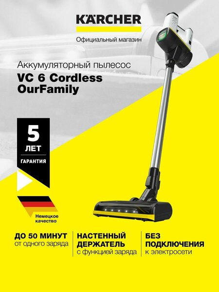 Пылесос вертикальный Karcher VC 6 Cordless ourFamily *EU 1.198-670.0 беспроводной. Решение для легкой и качественной уборки в больших квартирах или домах: аккумуляторный пылесос VC 6 Cordless ourFamily, впечатляющий небольшим весом, высокой силой всасывания и безмешковой системой фильтрации. Поддержание чистоты – это очень просто, если использовать для уборки вертикальный пылесос VC 6 Cordless ourFamily. В этом пылесосе для дома использованы многочисленные интеллектуальные решения, такие как механизм для быстрого опустошения мусоросборника, функция Boost и активная насадка для пола со светодиодной подсветкой для эффективной уборки в недостаточно освещенных местах. Другими преимуществами пылесоса с контейнером являются низкий уровень шума и наличие наглядного индикатора, отображающего состояние аккумулятора и другие сообщения. Кроме того, в пылесосе предусмотрен удобный фиксатор выключателя, исключающий необходимость постоянно удерживать его в нажатом состоянии. Настенный держатель с функцией заряда позволяет удобно хранить аппарат и заряжать его аккумулятор. Мощный (250 Вт) бесщеточный двигатель постоянного тока, питаемый от аккумулятора напряжением 25,2 В, гарантирует эффективную уборку. Оптимально сочетающиеся технические решения. Мощный аккумулятор напряжением 25,2 В оптимально сочетается с активной насадкой для пола. Оптимизированное время работы – 50 минут в нормальном режиме. Двигатель мощностью 250 Вт, активная насадка для пола, функция Caps Lock и 3-ступенчатая безмешковая система фильтрации. Продуманная система фильтрации. 3-ступенчатая система фильтрации: фильтр циклонного типа, входной фильтр и гигиенический HEPA-фильтр. Гигиенический HEPA-фильтр (EN 1822:1998) для выпуска особенно чистого воздуха. Легкое опустошение контейнера. Активная насадка для пола. Оптимальный сбор мусора благодаря моторизованной роликовой щетке. Высокая маневренность и возможность очистки пола под мебелью. Гарантирует тщательную очистку поверхностей. 2-ступенчатая регулировка мощности