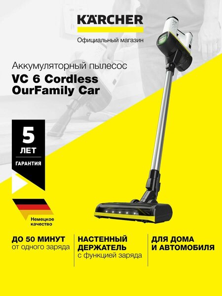 Пылесос вертикальный Karcher VC 6 Cordless ourFamily Car 1.198-672.0 беспроводной Керхер, режим Boost, автономная работа до 50 мин, безмешковая система фильтрации, белый